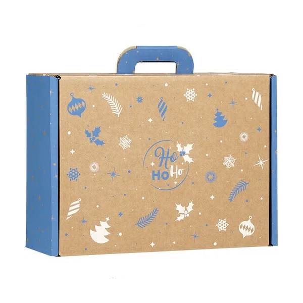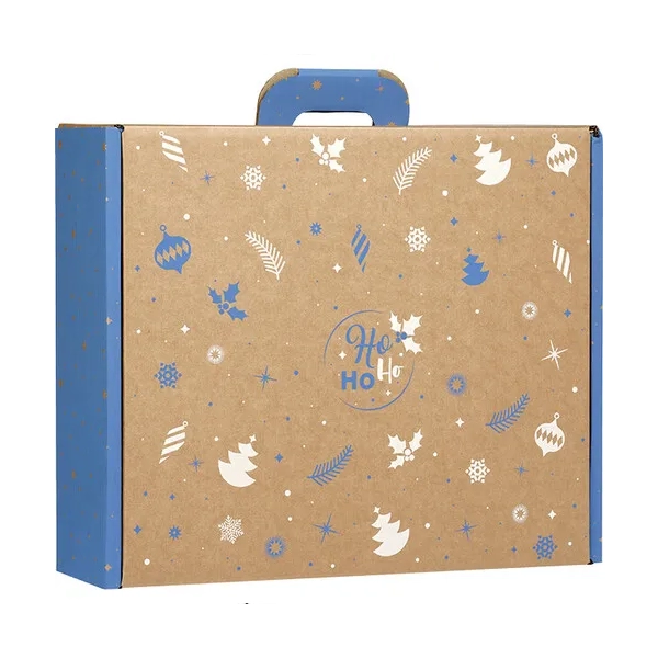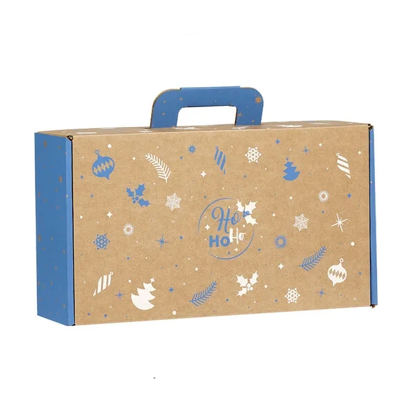 Com formato retangular e asa integrada em cartão, a caixa proporciona comodidade e segurança no transporte, mantendo os produtos protegidos e bem organizados. A estrutura sólida assegura estabilidade, enquanto o estilo intemporal permite que a embalagem seja reutilizada ou destacada pelo seu design elegante e festivo.