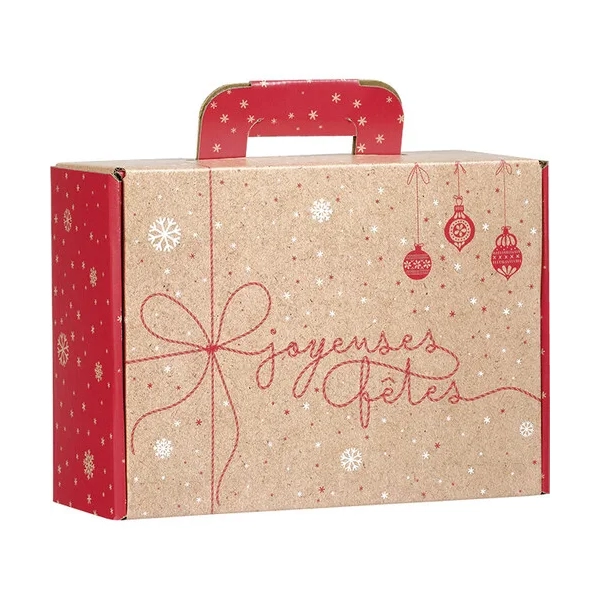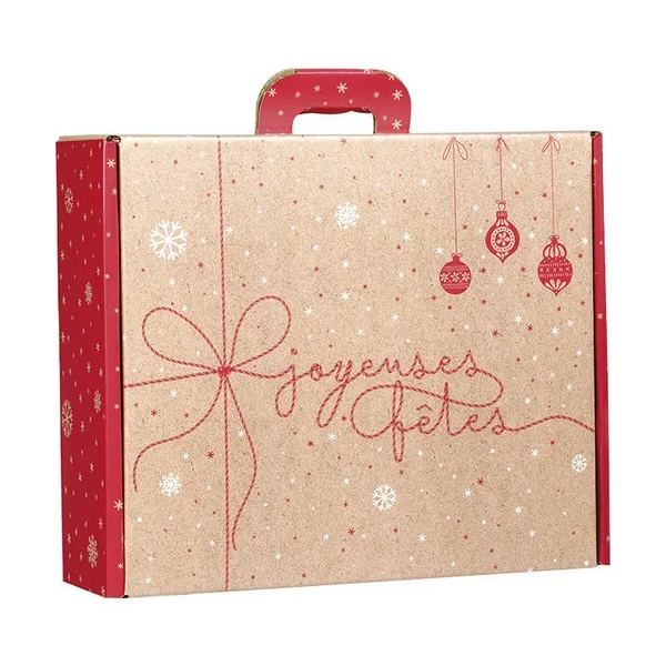 O seu fundo kraft natural contrasta elegantemente com os elementos decorativos em tons de vermelho, evocando a magia e o aconchego do inverno e das festividades de Natal. O design festivo transforma a caixa numa peça visualmente encantadora, adequada para uma ampla variedade de produtos, desde doces e artigos gourmet até lembranças, acessórios ou cosméticos.