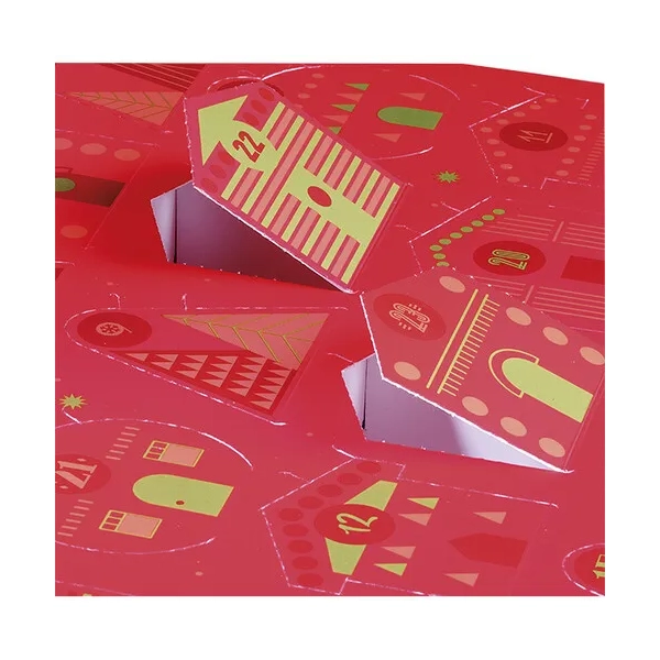 A caixa apresenta-se numa vibrante tonalidade vermelha — a cor clássica e calorosa do Natal — enriquecida por padrões em estilo mosaico que conferem um toque artístico e único à peça. Esta combinação de cor e design transforma o calendário num verdadeiro elemento decorativo, perfeito para criar uma atmosfera envolvente e natalícia.