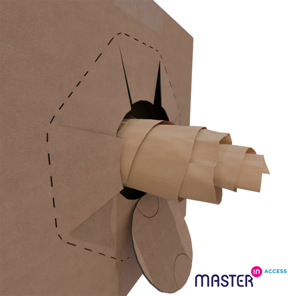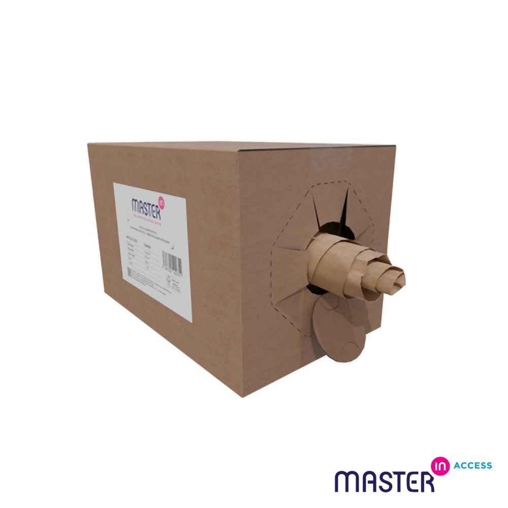 Fabricado com 100% material reciclado, o papel Master’in Access é uma alternativa sustentável e ecológica às embalagens tradicionais de plástico. A caixa dispensadora prática, com abertura perfurada, permite extrair o papel de forma fluida, sem bloqueios, evitando desperdício e aumentando a produtividade. Não é necessário nenhum conversor adicional, simplificando o processo de embalagem e tornando-o mais rápido e eficiente.